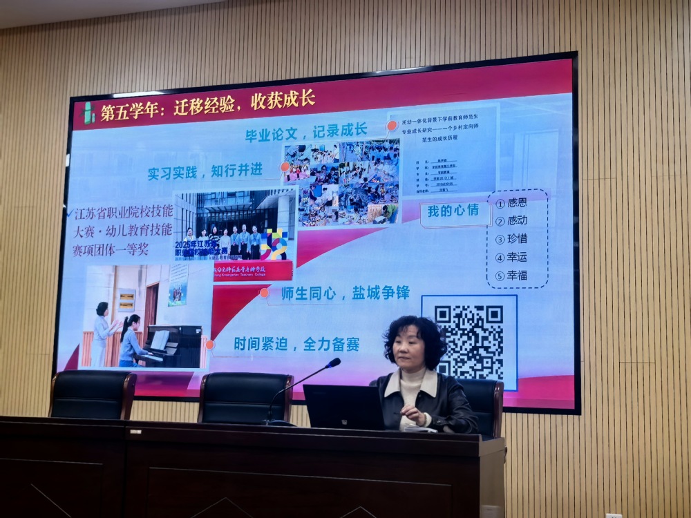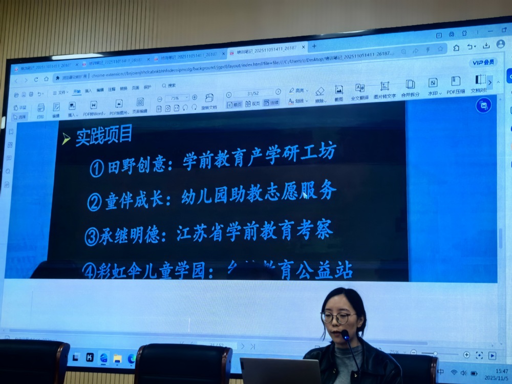 幼教理论教学部教师朱闪闪分享了她在南京师范大学参加“学前教育教育实践类课程培训”的心得体会,围绕教育实习、教育见习、实训室教学和社会调查,介绍了行业内各专家目前积极探讨的科学的教学目标设定、内容规划、过程指导及多元评价方法。本次分享旨在提升全体教师的教育实践类课程的设计、实施与评价能力。