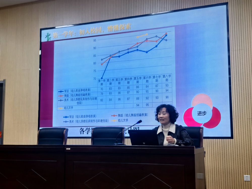 院长范雪飞介绍了定向师范生陈伊璐的成长过程,整体展现了一名师范生从初中到师范怎样顺利衔接过渡,从不安焦虑如何适应新环境,从紧张胆怯怎样实现自信表达,从技能欠缺、基础薄弱,如何打好专业基础,从普普通通的“幼苗”,如何成长为硕果累累的“大树”。一条条上升曲线、一次次精彩活动、一个个创新项目、一回回激烈角逐,是造就陈伊璐逐级攀升的坚实阶梯,也是学院多年来践行育人理念成果体现。通过对成绩的回顾和对现实的反思,范院长围绕课程建设课程改革、专业发展转型进行了深入探讨。接着对学生的思想政治思政工作、学业困难学生的帮扶指导工作、见实习安全工作也做了具体指示。