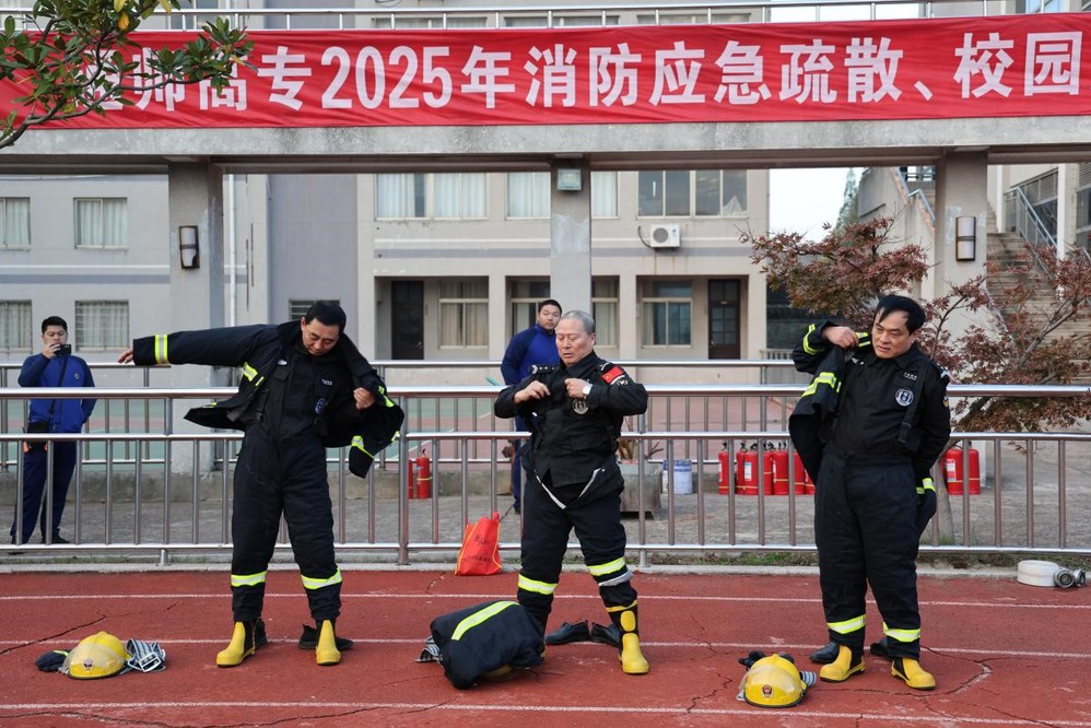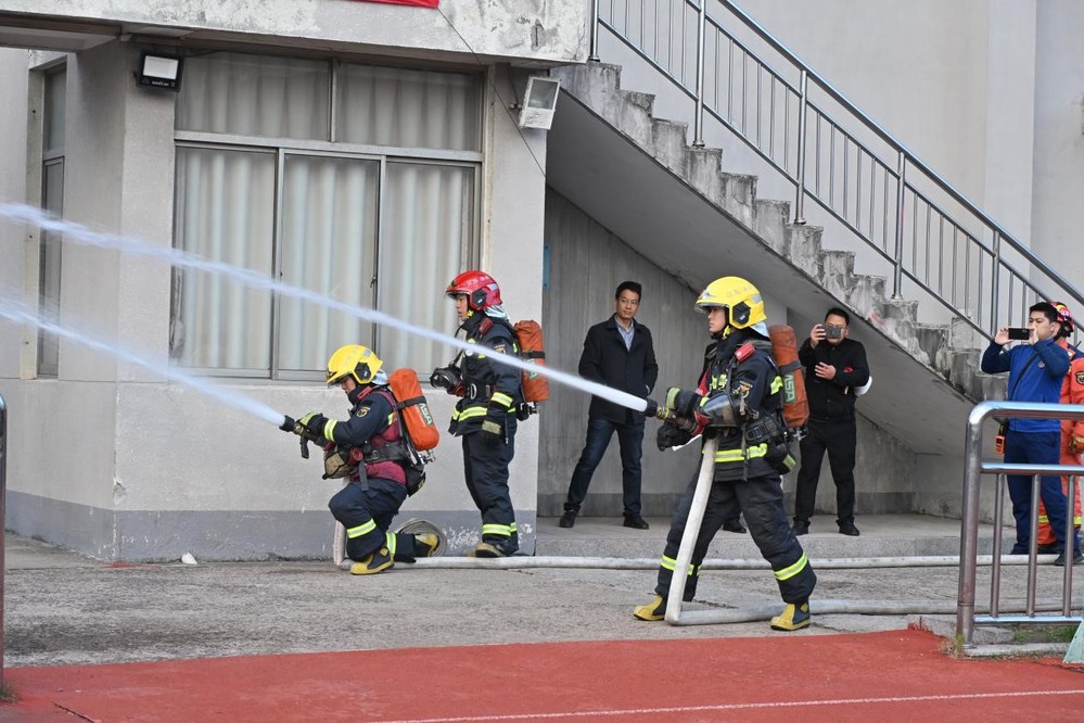 消防队员现场操作高压水枪,向同学们清晰演示操作流程与灭火要点。