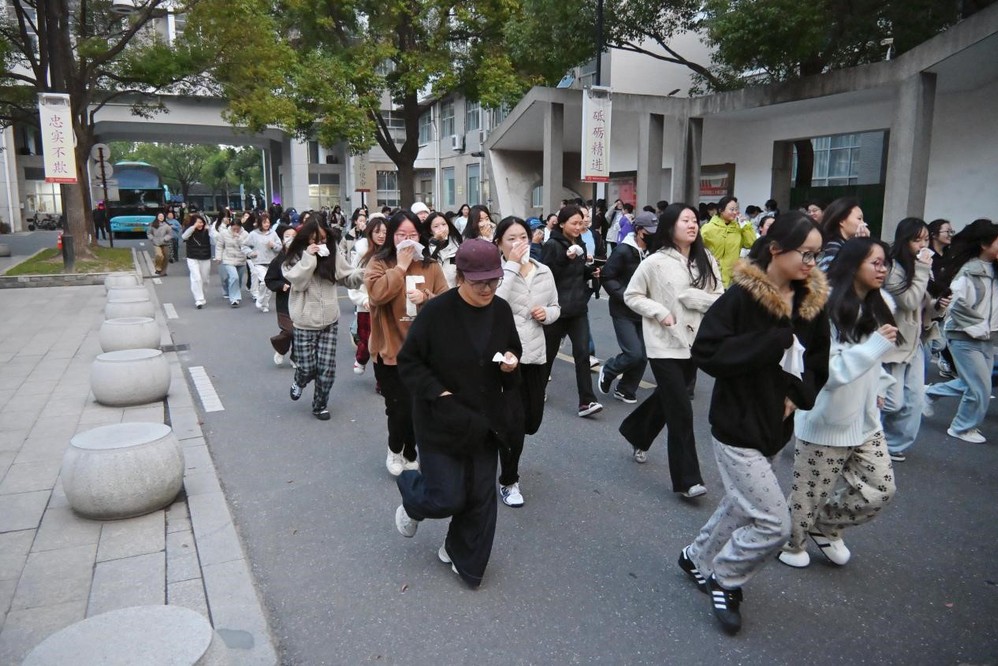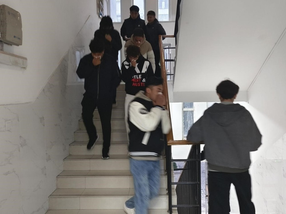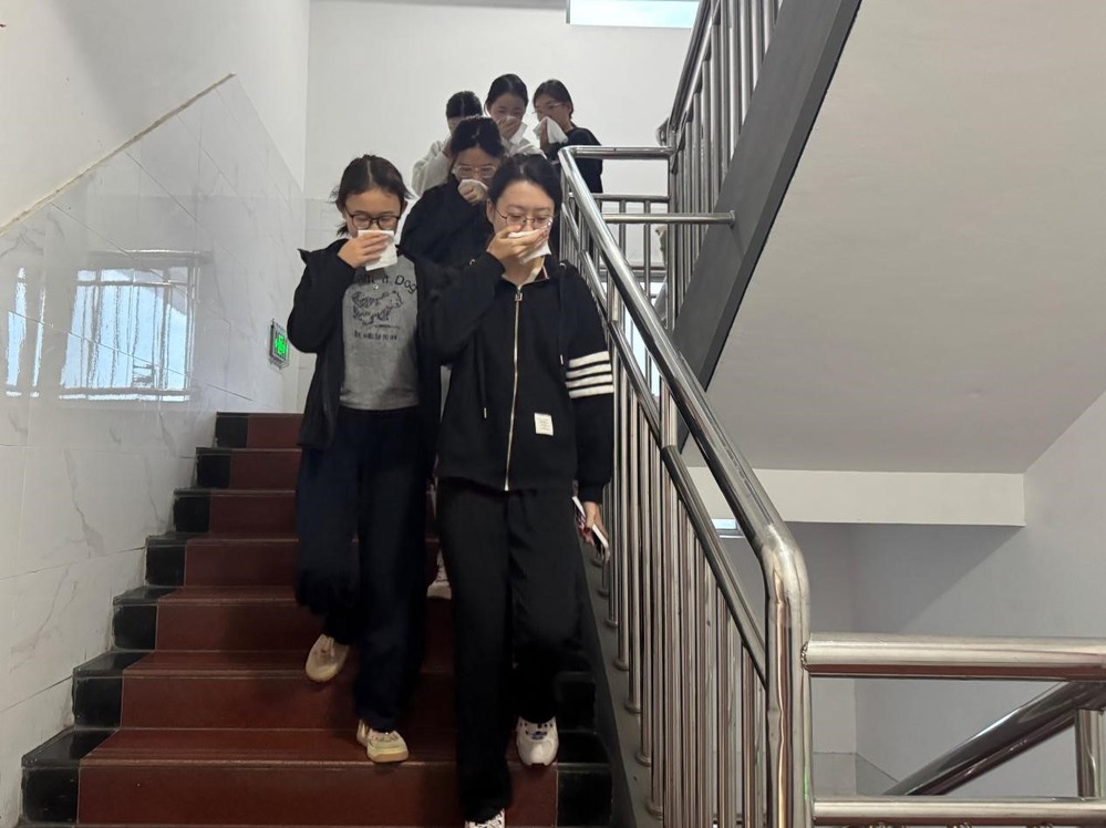11月12日上午6点40分,校园广播准时发出消防预警信号,演练正式拉开序幕。警报响起后,学生迅速捂住口鼻,弯腰低姿,保持间距,迅速撤离至安全区域。楼道内引导人员实时疏导,避免拥挤踩踏。从警报拉响到全员安全集结,仅用时7分钟。整个过程紧张高效,充分展现了学院师生过硬的应急处置能力。到达安全区域后,各班辅导员清点人数,并向演练总指挥杭斌报告本班学生情况,确保无一人遗漏。
