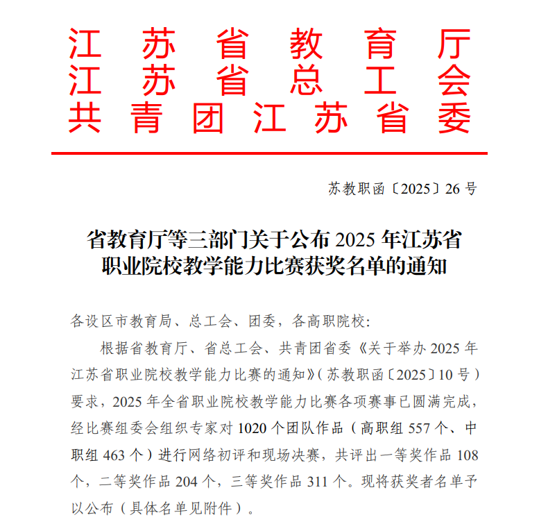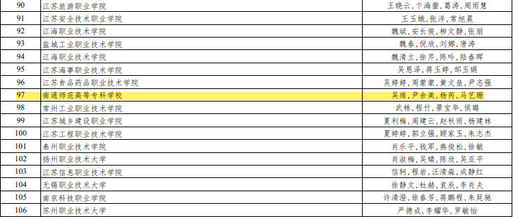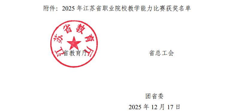 近日,江苏省教育厅、省总工会、共青团江苏省委联合公布了2025年江苏省职业院校教学能力比赛获奖名单,我院幼教技能教学部吴维、尹余美、杨芮、马艺珊团队获高职专业课程组三等奖。